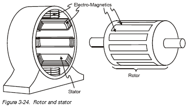 The way the AC induction motor works is it has two main parts to it: a stator and rotor. As the image above shows, the stator is stationary on the outside with electromagnets throughout it. The rotor is the cylindrical part that lies inside the stator and spins. The rotor also contains electromagnets that face outwards towards the stator. The electromagnets on the stator are setup with coils around it that when current flows through the coil, it creates a rotating magnetic field in the stator.